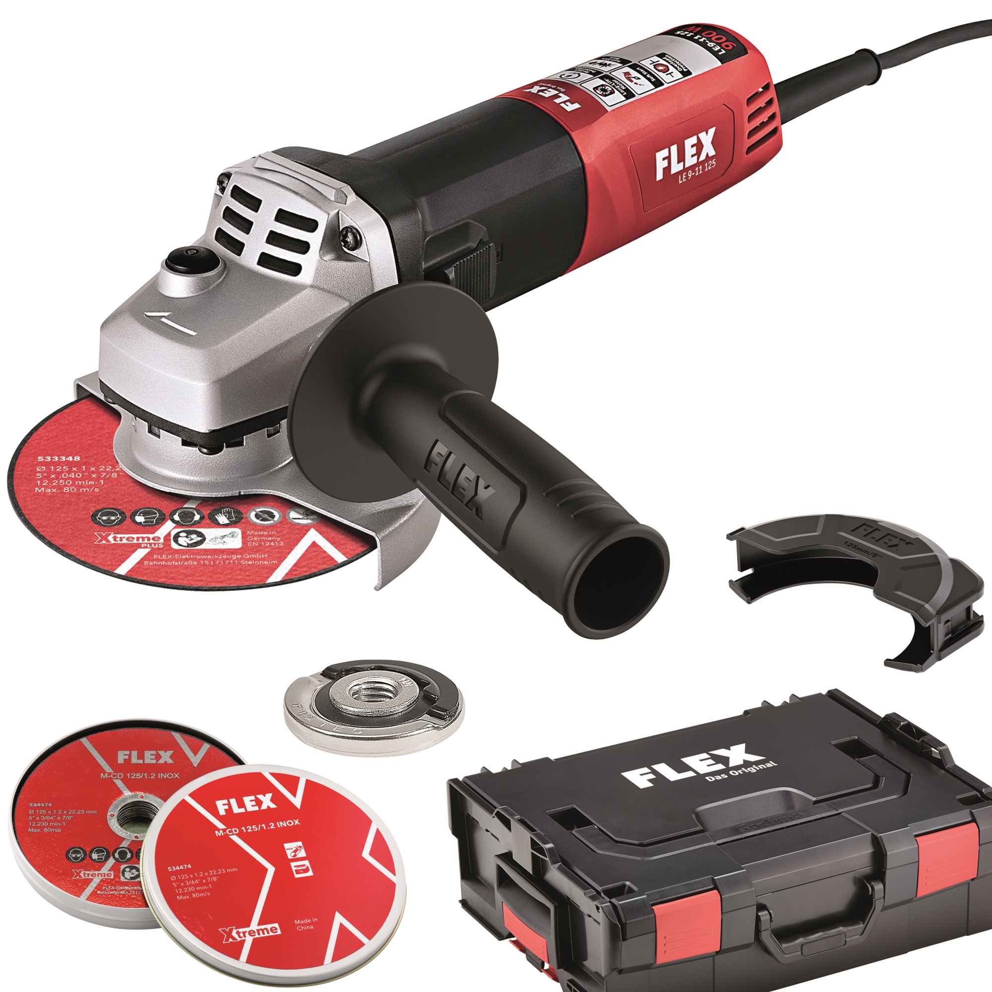 Das Kit FLEX LE 9-11 125 L-BOXX® + M-CD 125/1,2 INOX ist ein hochwertiges Aktions-Set für professionelle Trenn- und Schleifarbeiten. Es kombiniert den regelbaren 900 W Winkelschleifer LE 9-11 125 mit 10 extra dünnen INOX-Trennscheiben für saubere, gratfreie Schnitte in Edelstahl und Stahl – sicher verstaut im robusten L-BOXX®-Systemkoffer.