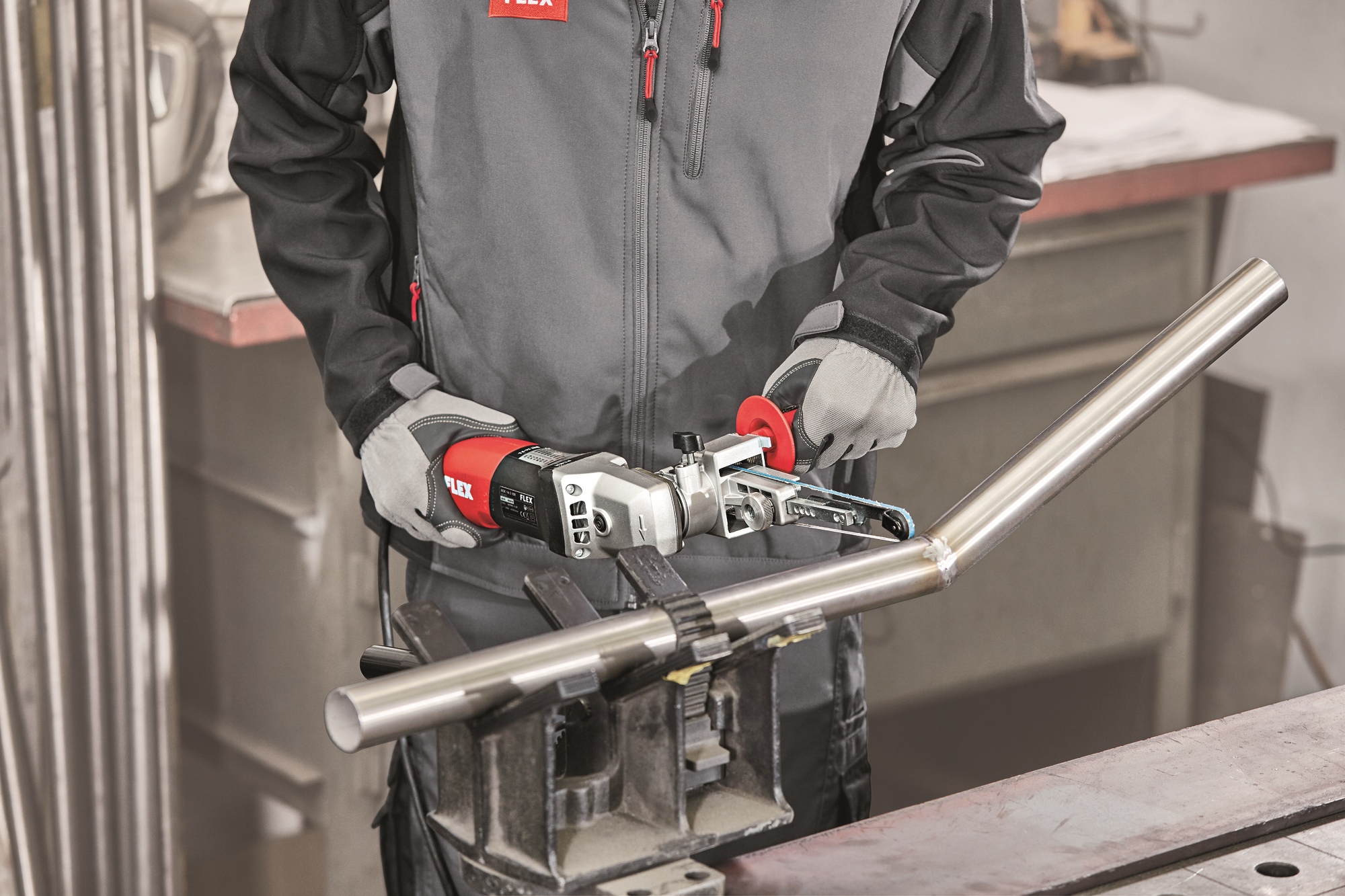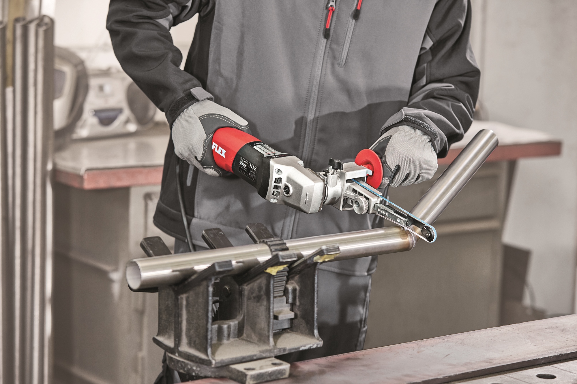 Einzigartiger Werkzeugvorsatz mit Schnellkupplung zum werkzeuglosen Wechsel der vier System-Vorsätze zum Satinieren und Rohrbandschleifen, zum Schleifen mit Bandfeile oder Kehlnahtschleifer