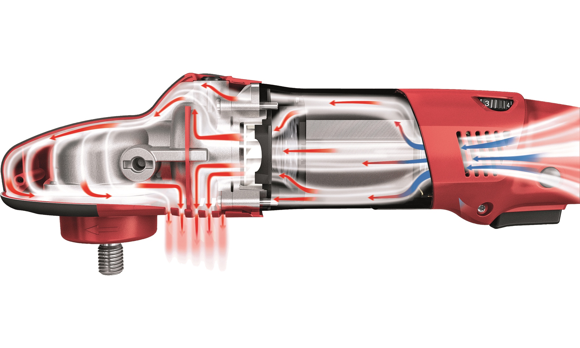 Optimierte Luftführung für bestmögliche Kühlwirkung von Motor und Getriebe. Keine störende Abluft für den Anwender
