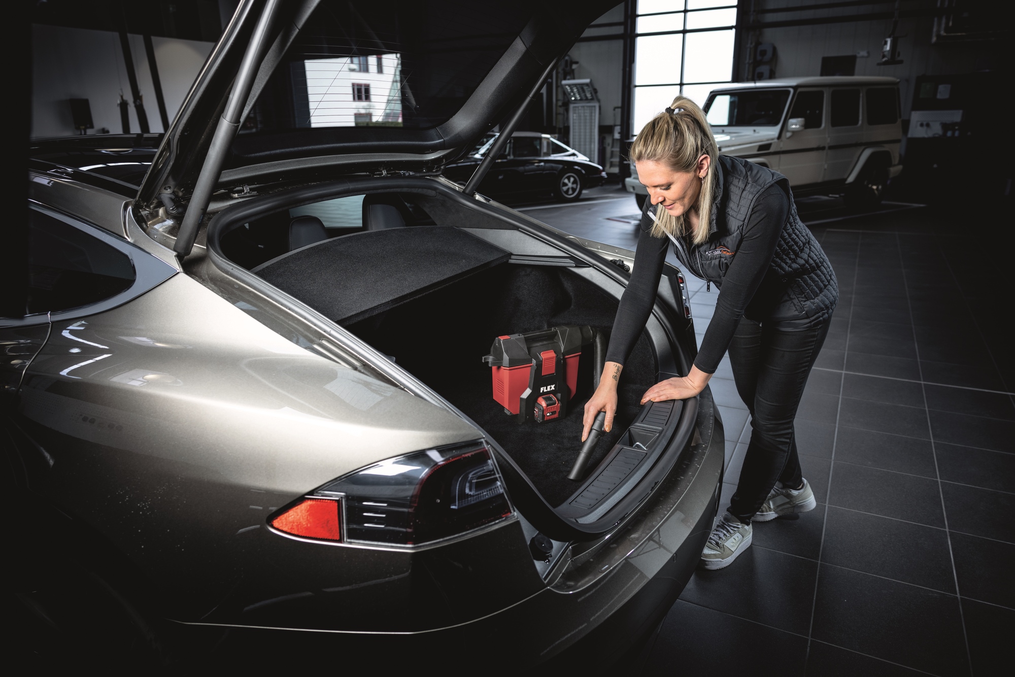 Leistungsstarker Sauger für den professionellen Einsatz bei der Endmontage, KFZ Reinigung etc. Einfacher Anschluss von FLEX Elektrowerkzeugen mit dem FLEX Clip-System für Absaugarbeiten