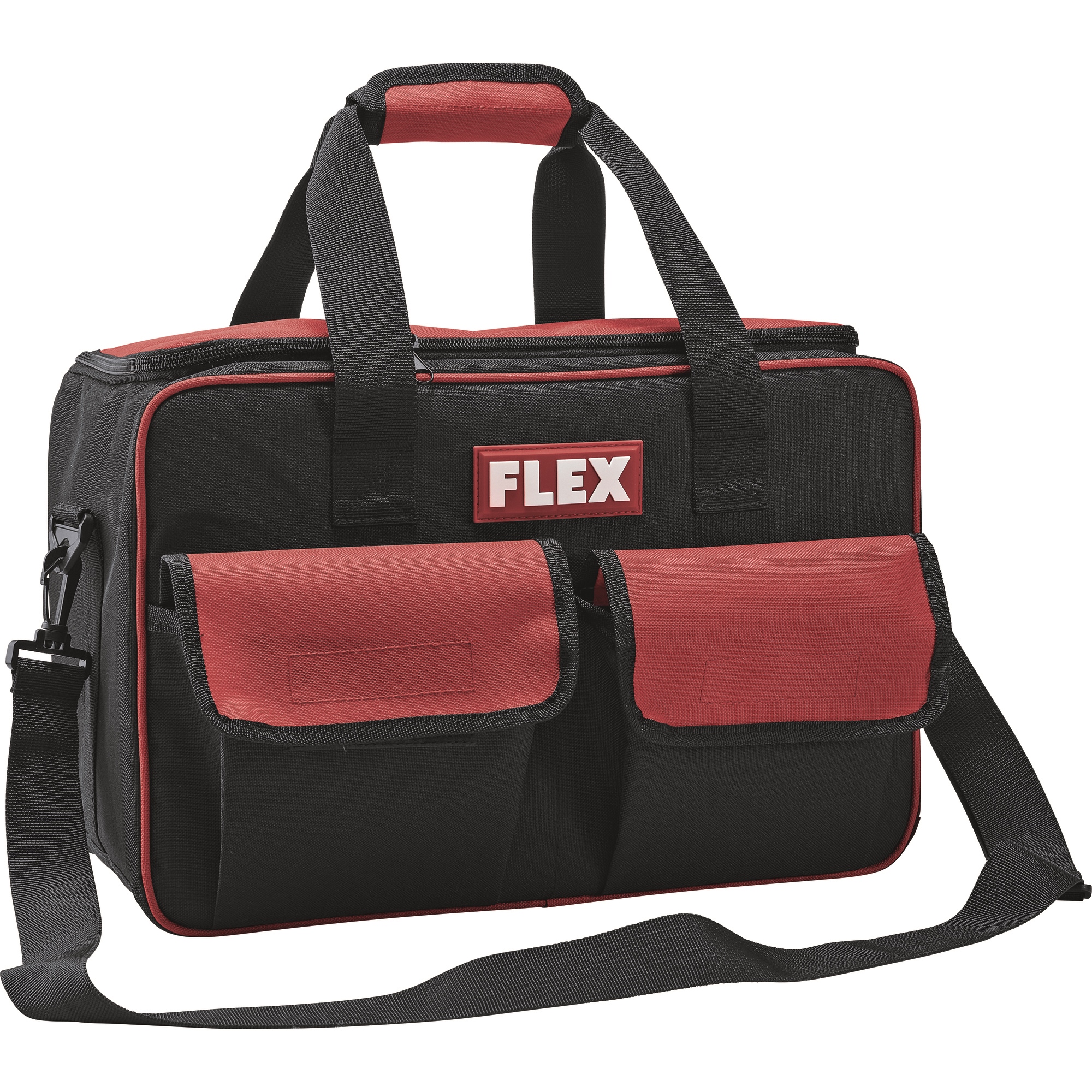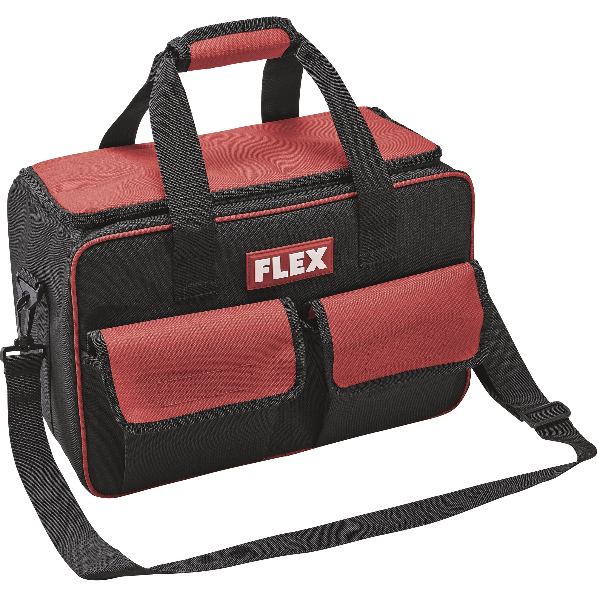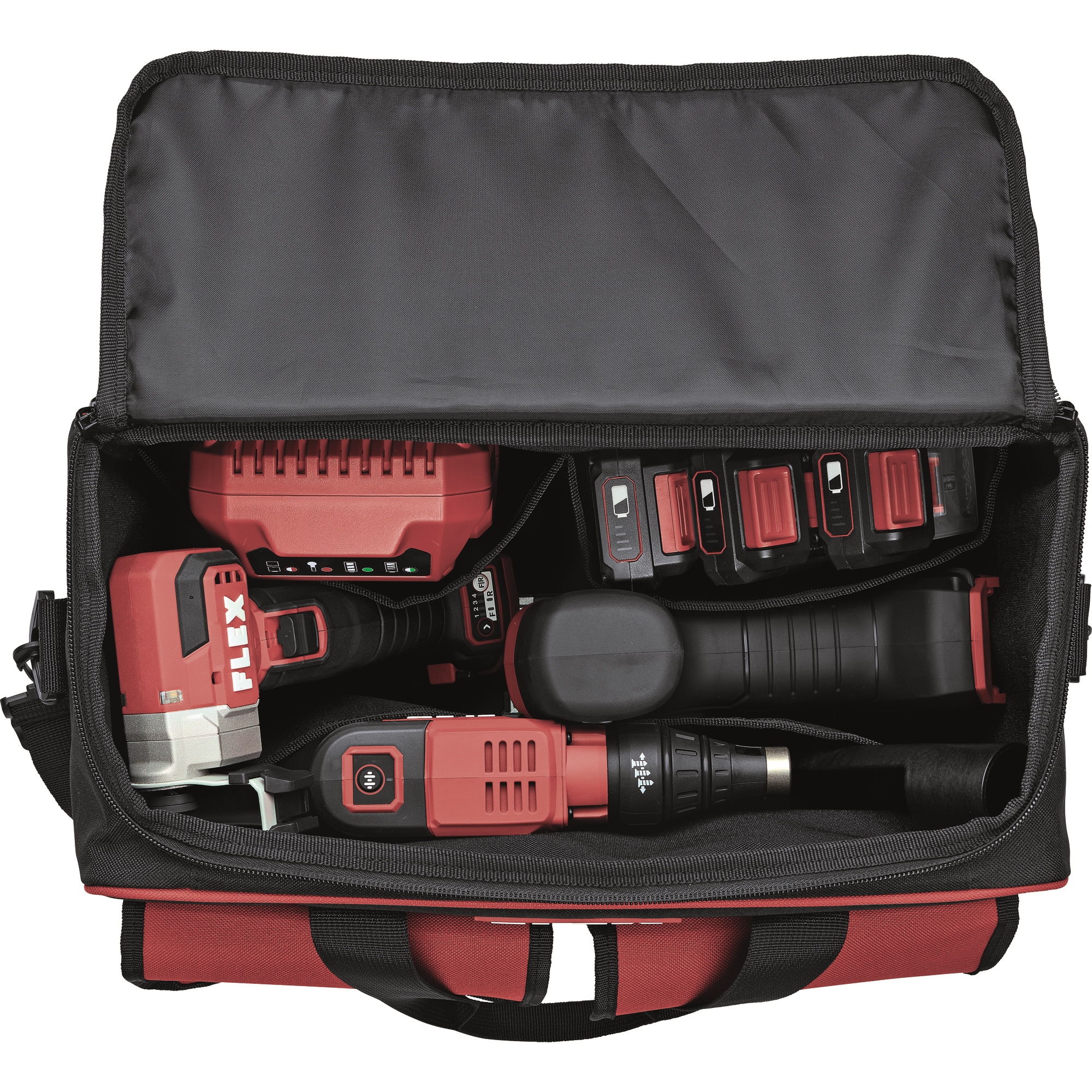 Sac de transport pratique en matière textile renforcée de plastique, résistante à la déchirure, avec large ouverture. Avec un grand espace de rangement à l'intérieur pouvant accueillir jusqu'à trois machines 12V, 2 poches extérieures à l'avant et des compartiments pour les accessoires tels que les batteries, le chargeur, etc.
