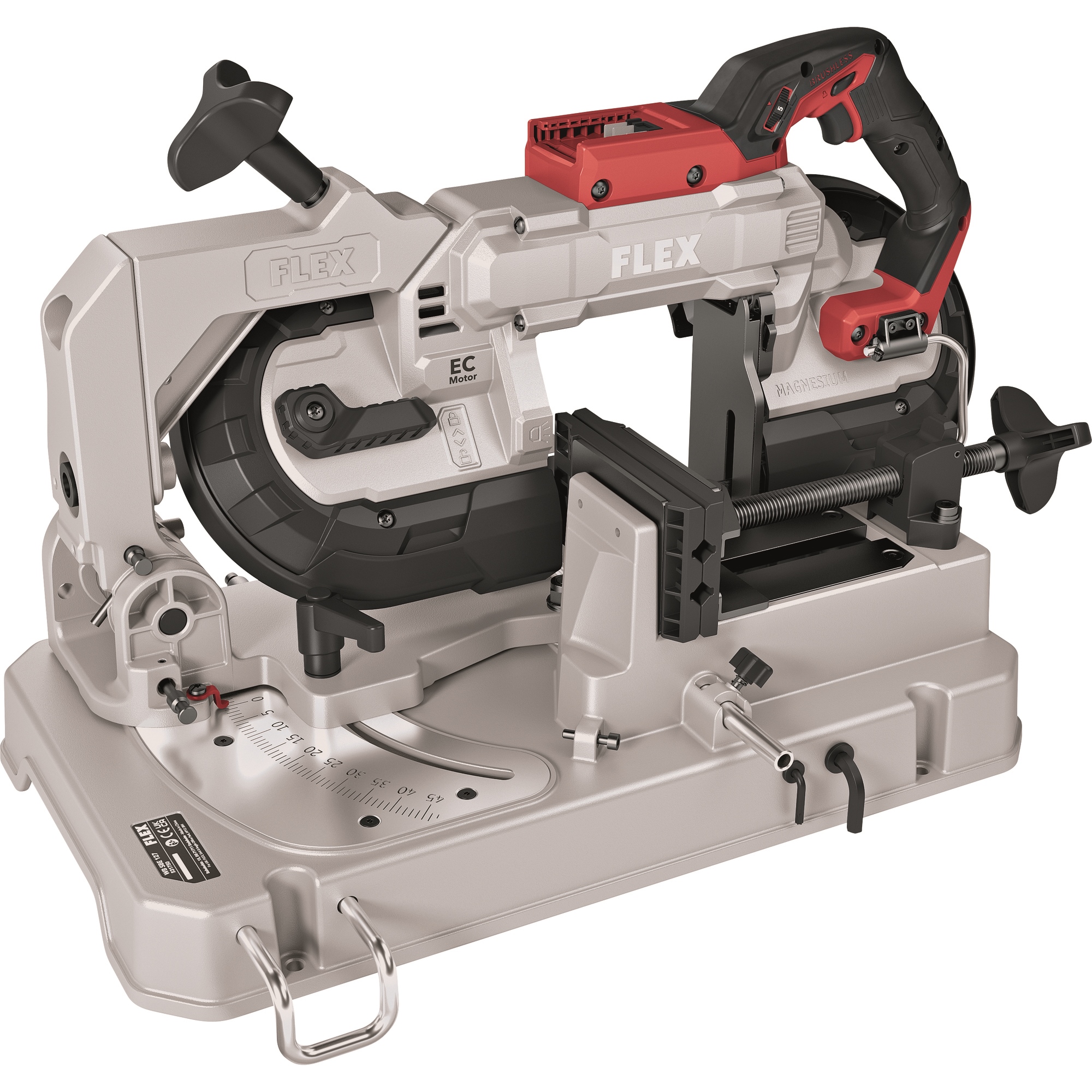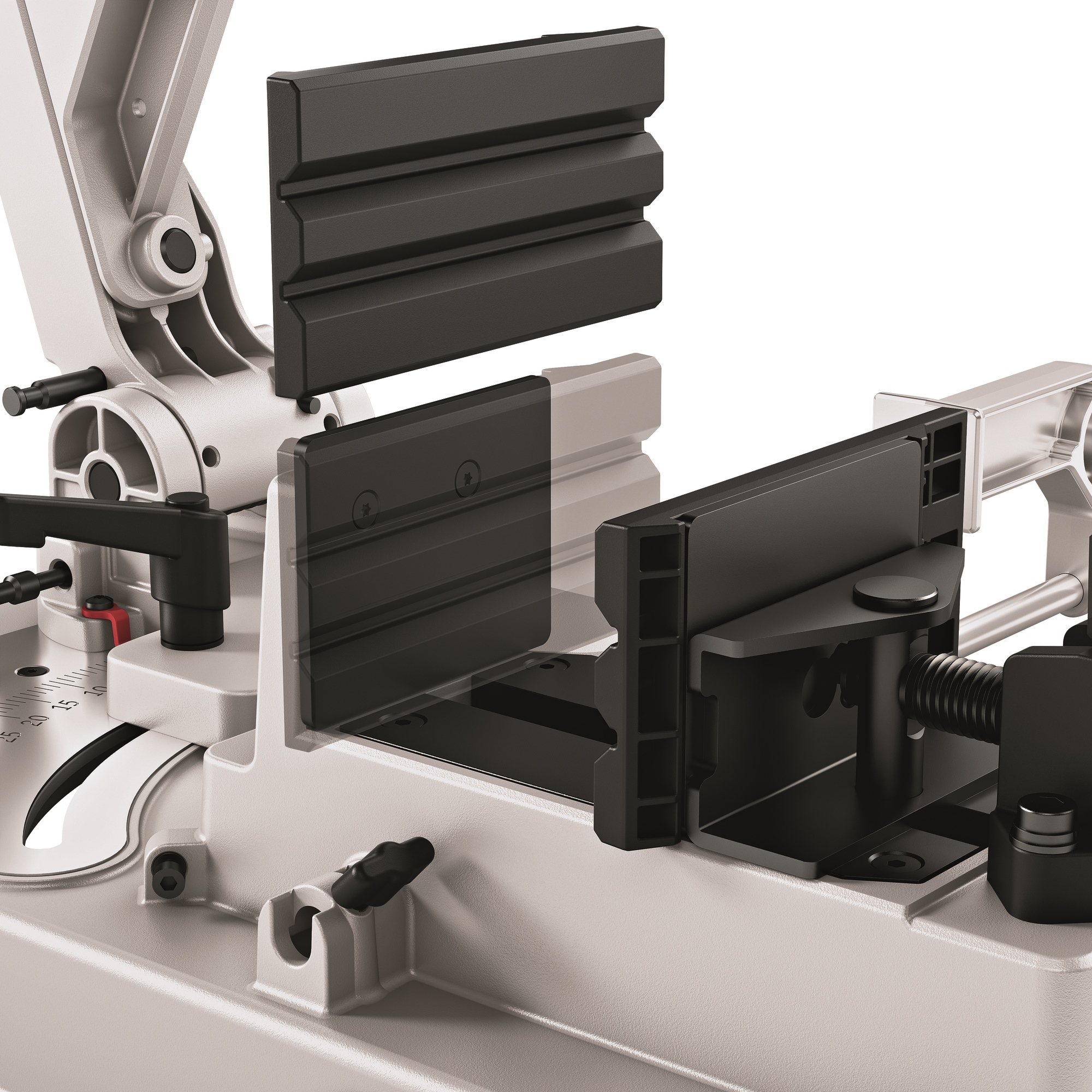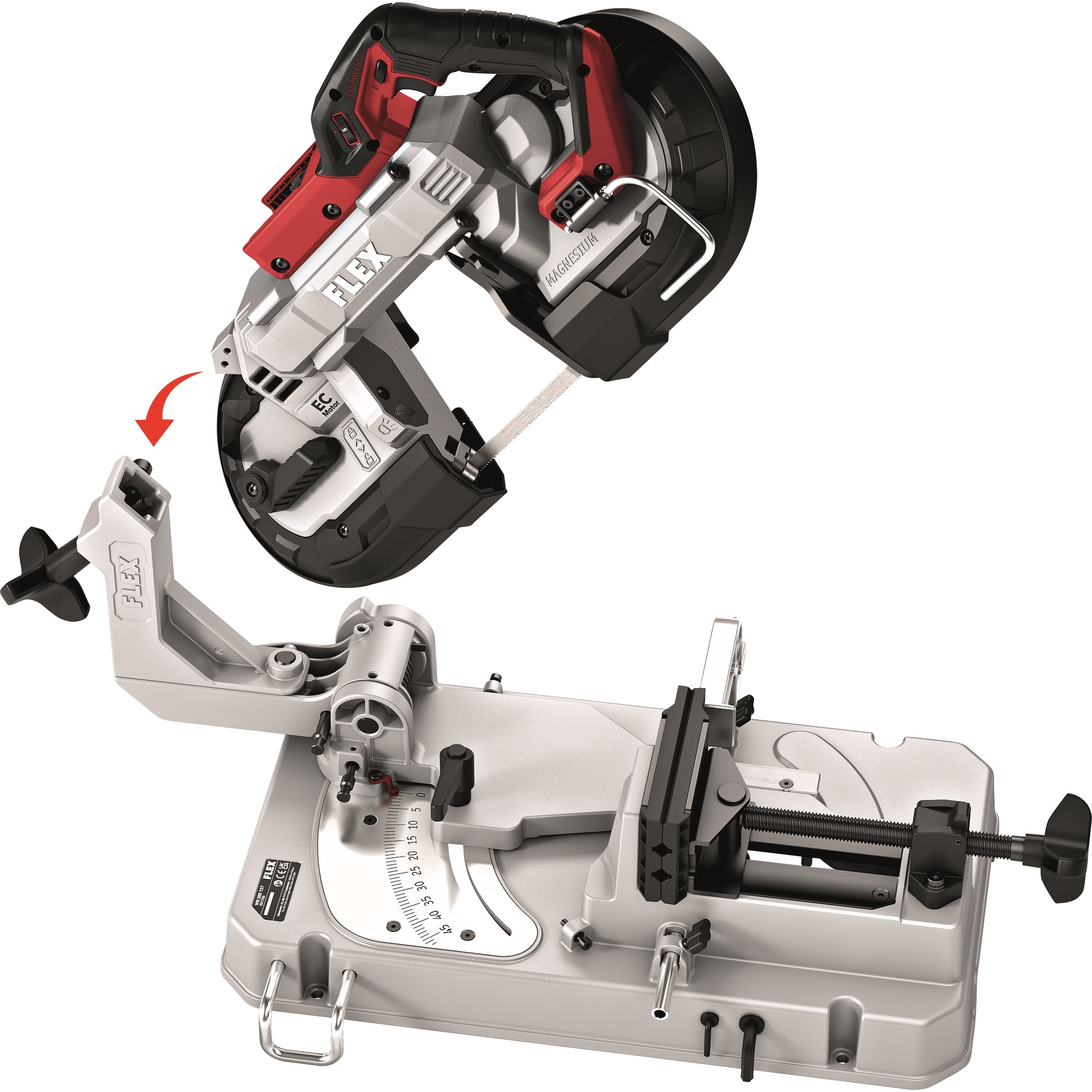 Pour utiliser la SBE 127 18.0-EC comme scie à ruban semi-stationnaire. Montage simple avec un grand bouton rotatif et un levier de blocage pour une fixation rapide. Le bras est soutenu par un ressort et supporte le poids de la scie à ruban. Échelle graduée bien lisible de 0 à 45°. Comprend un étau stable avec des mâchoires d’insertion pour les tubes et autres profilés à surfaces fragiles. Avec butée de longueur flexible des deux côtés, jusqu’à 310 mm à droite et 380 mm à gauche. Ainsi, le travail avec la scie à ruban sur batterie et la table est encore plus précis et plus facile. Si nécessaire, la table peut être montée sur le socle WB 110-260.