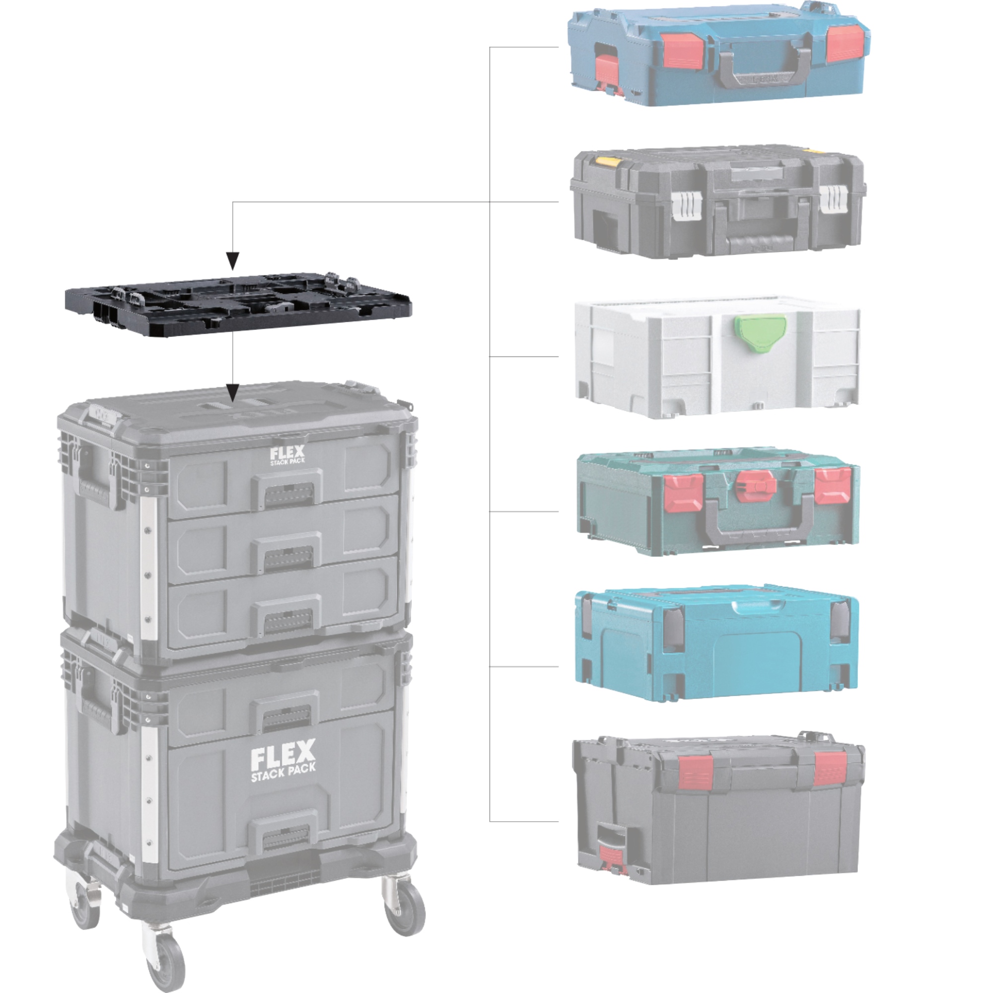 Per fissare tutte le casse comuni al sistema STACK PACK. La piastra di adattamento consente di combinare le casse STACK PACK con le seguenti casse: